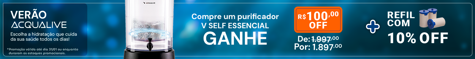 Com o Purificador de Água Acqualive V10 você tem um filtro de água purificador capaz de transformar a água comum em uma água pura. alcalina. rica em magnésio. livre de cloro e com poder alcalinizante. Esta versão é adaptada para substituir galões e bombonas em bebedouros que gelam a água.   OBS: Base gelada/bebedouro não incluso.
